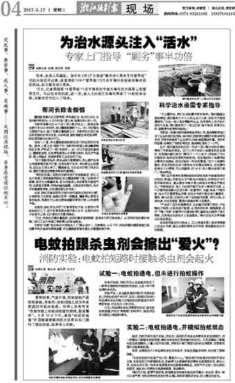 夏季到来,气温升高,防蚊驱蚊产品逐渐走俏,杀虫剂、电蚊拍随之成为许多家庭的灭蚊必备品。但网上却有传言“杀虫剂碰上电蚊拍会猛烈燃烧,甚至爆炸”。5月15日下午,本报“消防实验室”栏目邀请慈溪消防大队官兵专门进行了模拟实验,结果令人吃惊。