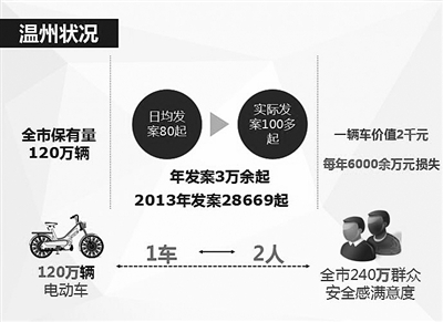 以往在温州,电动车被盗算得上是老百姓的“心头恨”。比如2013年,温州市共发生电动车被盗案件2.8万余起,日均发案80起左右,占全部刑事案件的七分之一,占全部盗窃案件的四分之一。