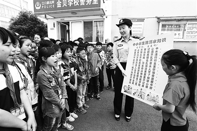 天气渐热,针对民工子女夏季溺水事故多发的实际情况,台州市公安局黄岩分局专门部署开展以防溺水为主题的安全防范宣传教育活动。图为江口派出所民警在金贝民工子弟学校教孩子们朗读防溺水顺口溜。