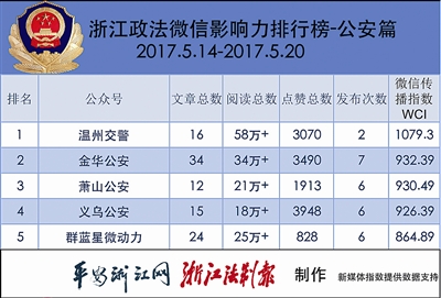 本期公安榜,“温州交警”获得58万+阅读总数,以绝对优势夺下冠军。“金华公安”和“萧山公安”继续保持前三地位,分别获得第二三名。