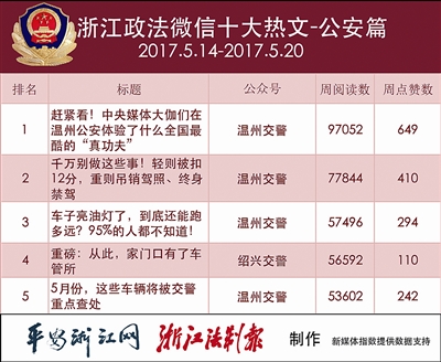 公安热文榜,前三均被“温州交警”拿下,《赶紧看!中央媒体大伽们在温州公安体验了什么全国最酷的“真功夫”》夺得第一名;两篇交通类提醒文章《千万别做这些事!轻则被扣12分,重则吊销驾照、终身禁驾》和《车子亮油灯了,到底还能跑多远?95%的人都不知道!》分别排名二三位。公安榜前几名中,“温州交警”发布的文章总数并不算多,但获得如此成绩,看来文章贵不在多,而在于精。