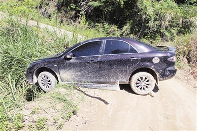 周某又将车子开到一处山崖边,挂上前进档后逃离,想让车子坠入山沟,未曾想车子前轮驶出山崖后,底盘卡在了悬崖边。精疲力竭的他再也无法将车子推下山崖。