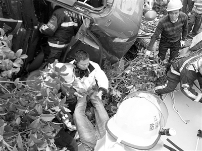 今年3月31日早上7点多,下着大雨,S31杭新景高速凤川到深奥路段发生一起交通事故,一辆重型货车追尾一辆运载集装箱的半挂车后穿过中央隔离带,冲到了对向车道,结果翻下了高速公路,驾驶员邓某被卡在了受损变形严重的驾驶室里,动弹不得。