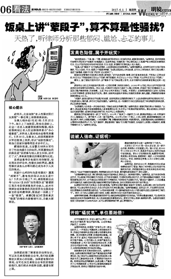 “饭桌上讲‘荤段子’也可能构成侵权,从而承担相应的法律责任。”金律师解释说,这种常见的行为是不是性骚扰,可以从动机、行为、结果三个维度来判断,“如果主观动机上存在故意,且行为上有性暗示,同时又给当事人造成了羞辱感,那就不只是‘开玩笑’这么简单了”。