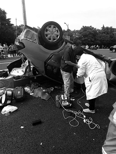 本报讯 3天前,杭州江干区九华路九昌路口发生了一起车祸,两车相撞后,一辆香槟色小轿车侧翻,车子四脚朝天,被困男子头部被压在车底下,当场死亡。