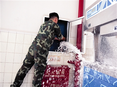 随后,消防检查人员对教学楼内的消火栓箱进行逐个检查,要求学校重点检查出现爆裂现象的同一批水带,同时要求学校对部分指针已经处于黄绿交界处濒临失效的灭火器进行紧急更换。