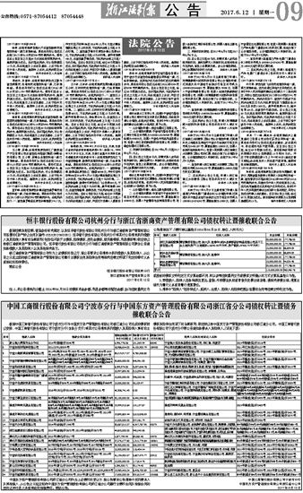 恒丰银行股份有限公司杭州分行与浙江省浙商资产管理有限公司债权转让暨催收联合公告