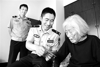 近日,绍兴章镇派出所民警朱泽彬再次来到岭南乡立功村,为九旬老人王云美送上补办好的身份证。