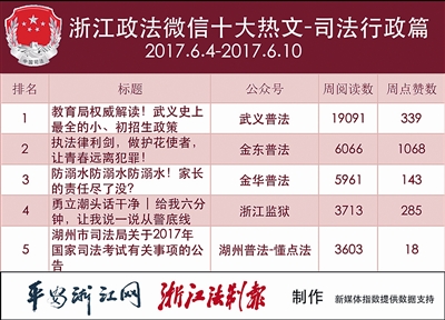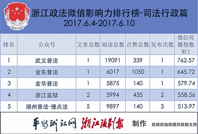 本期司法行政榜,“武义普法”可谓是一匹黑马,从榜外直接冲到榜首,“浙江监狱”和“湖州普法-懂点法”仍保住了前五地位。