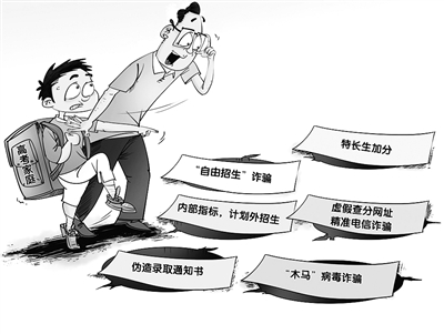 每年高招录取期间,总有不法分子利用考生和家长急迫心情,设局诈骗。有关部门提醒家长谨防所谓“分不够,钱来凑”的虚假招生承诺,以及“内部指标”、虚假查分网址等诈骗手段。
