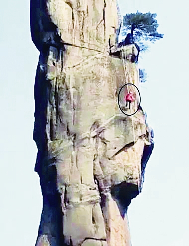 | 今年4月,游客利用钻孔、打钢钉、挂绳索等方式擅自攀爬巨蟒峰。 |