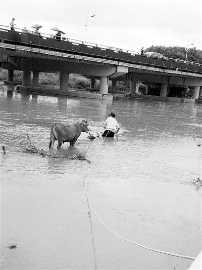 眼看牛快被冲走了,下水!