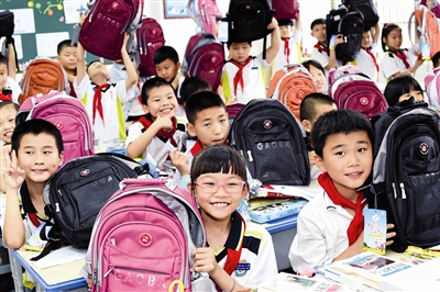 6月19日,义乌市爱心公社的志愿者在欣欣小学开展“爱心书包送爱心”公益活动,600名小学生获赠书包等学习用品。今年5月以来,义乌爱心公社的志愿者已经为新疆、安徽、贵州、四川及浙江泰顺等地的家庭困难学生,送去了1.3万余只爱心书包。