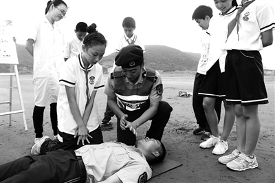 6月19日下午,浙江公安边防总队舟山边防支队高亭边防派出所在辖区海滩开展“珍爱生命,远离溺水”安全警示教育宣传活动。边防官兵用警示教育图板为学生们讲解溺水急救知识,并专门邀请医护人员现场演示溺水急救的技术要领。