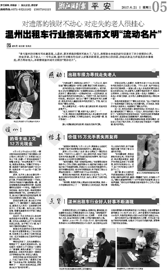 温州出租车行业不断涌现的好人好事,不仅弘扬了拾金不昧的传统美德,也展示了行业的文明新风貌,更取得了良好的社会效益。
