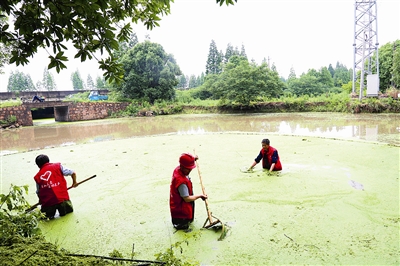 22日,湖州市吴兴区埭溪镇小羊山村,10多位党员志愿者正在往圻机埠旁水潭打捞浮萍,清理垃圾。进入6月以来,因气温升高,一些小微水体浮萍滋生,影响水质。该村利用“党员主题活动日”,组织党员干部清理,改善水质。
