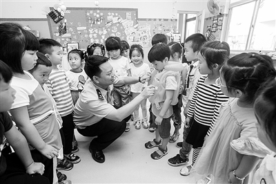“一个人不能去游泳”“救生衣要这么穿”,昨天,台州市公安局黄岩分局民警来到新砚池幼儿园开展暑假前的安全防范教育。图为民警在教小朋友穿救生衣。