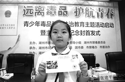 26日,由湖州市司法局、市教育局、团市委、市禁毒办、市普治办联合组织开展的以“远离毒品,护航青春”为主题的湖州市青少年毒品预防法治教育活动正式启动。为配合《国际禁毒日》纪念邮票发行和主题活动开展,湖州市司法局、市禁毒办、市邮政公司特别制作了发行纪念封一枚。图为湖州吴兴区文苑小学少年邮局的同学在向大家展示纪念封。