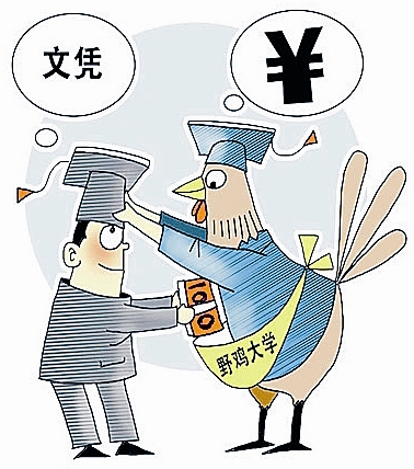 《围城》里,方鸿渐买了一张克莱登大学的学历文凭以充博士生,克莱登大学即属于我们俗称的“野鸡大学”。“野鸡大学”在现实生活中仍然存在,广东省教育厅日前就公布了挂着“广”字头的一批“野鸡大学”的名单。