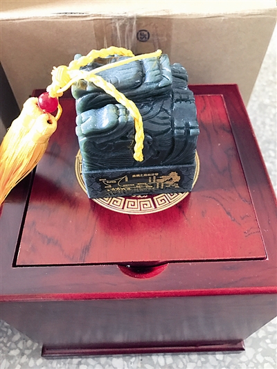 对方介绍说,现在他们有一款“中华传世徽宝”,是为了纪念两岸领导人的历史性握手而推出的玉器收藏品,非常有收藏价值。这么大的名头,瞬间就把梁大爷给唬住了。他想,中央的东西肯定没人敢仿,机会的确难得,于是,他马上汇了4800元过去,青白玉版的“中华传世徽宝”也很快就到货了,一起寄来的还有“鉴定证书”和“发票”。
