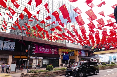 随着7月1日香港回归祖国二十周年纪念日的临近,香港大街小巷、商场等装饰一新,充满浓浓的喜庆气氛。
