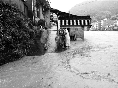 | 开化县苏庄镇茗富村茗川自然村网格员在行动,为村民转移家畜 |
