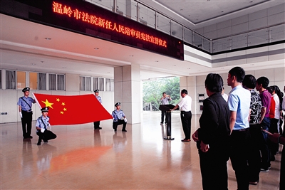 本报讯 近日,温岭法院45名新任人民陪审员,手握拳头,在国旗前庄严宣誓。