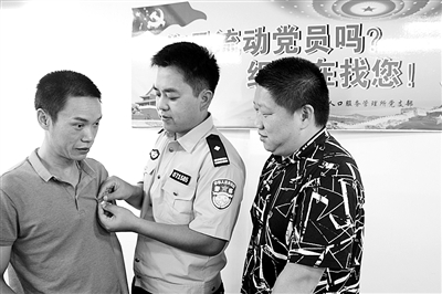 昨天下午,临海市杜桥派出所会同当地流管所,邀请部分流动党员开展“七一”党日活动。近几年,杜桥镇充分把握流动党员资源优势,把他们吸收进新居民联谊会,起到“以外管外、以外帮外,以外带外”的效果,同时也让流动党员离乡不离党、流动不流失。图为民警为流动党员戴上党徽。