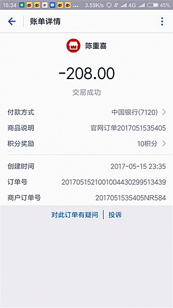在这个“官网”上购买过产品的邹女士对记者称,前段时间自己搜索官网后,发现了这个网站并花了208元钱购买了一款腮红,“收到货之后觉得像假的,没有注册号码,但是网站没有退货选项,联系了客服,也不理我。”邹女士发来的支付宝信息截图显示,这208元腮红钱是汇给了一个叫“陈重喜”的个人账户。