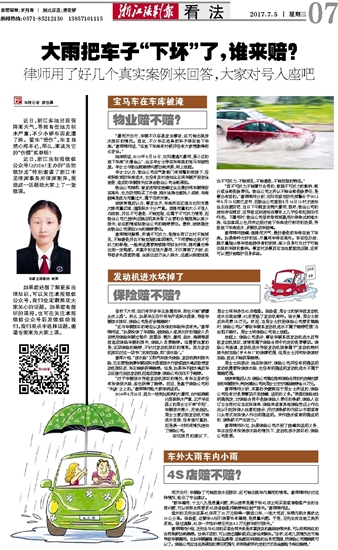 近日,浙江多地出现强降雨天气,导致有些地方积水严重,不少小轿车因此遭了殃。爱车“受伤”,车主自然心疼不已,那么,谁该为它的“伤情”买单呢?