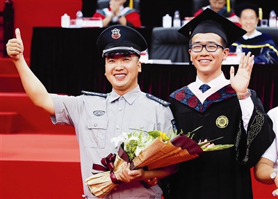 7月4日,在北京大学2017年本科生毕业典礼暨学位授予仪式上,一名毕业生代表(右)向学校保安代表献花。