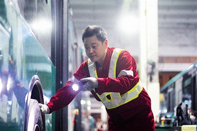 时间刚过晚上8点,车间里已停满了等待维修保养的公交车,一名名身穿红色工作服的维修工穿梭在这些车辆中。这其中,蒋建峰的那一抹红最为亮眼。