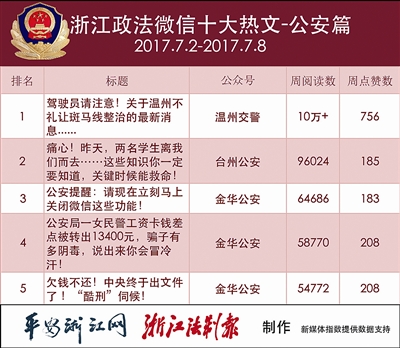 热文榜,“温州交警”的《驾驶员请注意!关于温州不礼让斑马线整治的最新消息……》以10万+的阅读数夺下冠军。“台州公安”的《痛心!昨天,两名学生离我们而去……这些知识你一定要知道,关键时候能救命!》获得第二名。“金华公安”的《公安提醒:请现在立刻马上关闭微信这些功能!》获得第三名。交通提醒、暑期安全、微信使用安全这三大主题备受读者青睐,连着两期抢占热文榜前三。