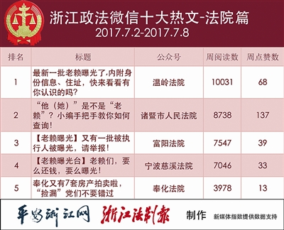 本期热文榜,依旧是三篇“老赖”主题的文章夺榜,“温岭法院”的《最新一批老赖曝光了,内附身份信息、住址,快来看看有你认识的吗?》获得冠军。“诸暨市人民法院”的《“他(她)”是不是“老赖”?小编手把手教你如何查询!》和“富阳法院”的《【老赖曝光】又有一批被执行人被曝光,请举报!》分别获得亚、季军。