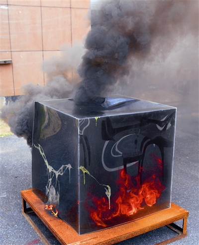 只见点燃的纸片从箱子顶上落下,箱内出现了轰燃现象,气流很快将箱体冲开,火苗迅速燃烧起来,明火伴着滚滚黑烟将整个亚克力箱子笼罩。