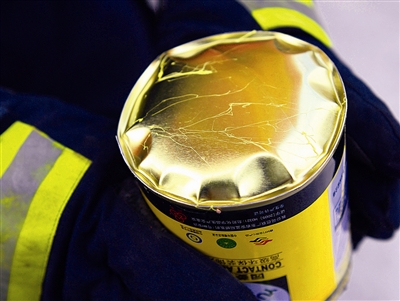 11分05秒,只听到“砰”的一声,箱内一罐万能胶的盖子被炸飞,罐体内的万能胶出现冒泡沸腾的现象。