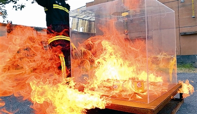 随后,全副武装的消防员将一小片纸条点燃,迅速投入亚克力箱内,模拟万能胶遇到明火的情况。