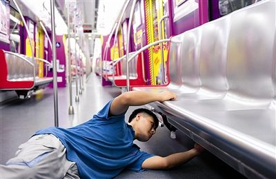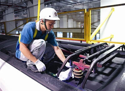23号股道上,钱敏和王宇文开始了一天中最忙的时候。年轻的脸庞,执着的眼神,熟练的动作,是他们给记者的第一印象。眼前是一辆正在等待“A检”的列车,“‘A检’是一次全面、系统的检查,一般每半个月查一次。这辆列车已经行驶1万公里,到了彻底检查的时候。”钱敏说。他和王宇文默契地走到列车两侧的地沟下,打着手电对列车底部的各个部件进行检查,从车顶的碳滑板、受电弓,到车厢内的灭火器,安全锤,以及螺钉的防松线和钩舌杆,任何零件都不能放过。