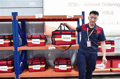 7月17日,在广州南站网络订餐配送中心,工作人员准备将外卖送上列车。