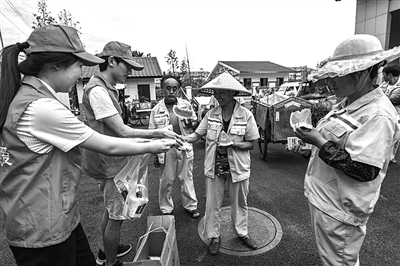 7月19日,志愿者把解暑的药品送给凤山街道垃圾中转站的工人。