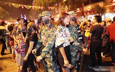 近日,昆明,在2017年中国石林国际火把狂欢节上,市民游人玩得嗨翻天,在街道上站岗执勤的武警战士也被抹成大花脸,又不时受到喷雪“袭击”,依然认真值守岗位,引得不少游人前来留影。