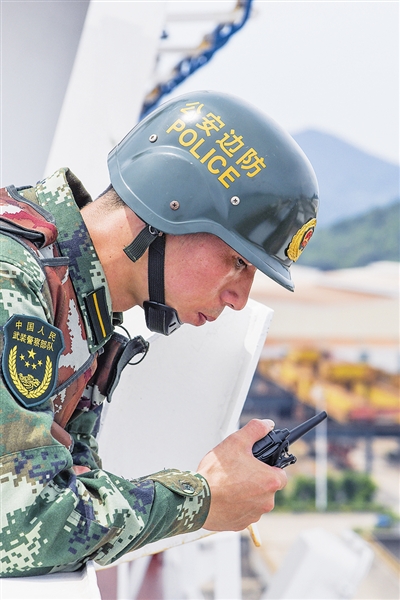 7月19日,上午9点30分,舟山某外轮修船厂1号码头,一阵尖利的警报声骤然响起,正在巡逻的舟山边防检查站监护中队战士发现某国“信心”号轮上有2名手持凶器的疑似偷渡人员。