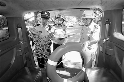 昨日,台州市公安局黄岩分局警务督察大队督察警对派出所出警车携带救生圈、救生绳、救生衣等救援装备的情况进行了检查。高温时节,派出所经常会接到营救落水者等救援任务,装备是否携带齐全直接关系到救援任务能否完成。