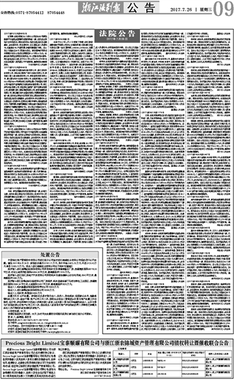 Precious Bright Limited宝泰顺耀有限公司与浙江浙农锦城资产管理有限公司债权转让暨催收联合公告