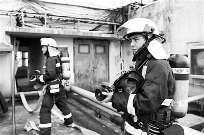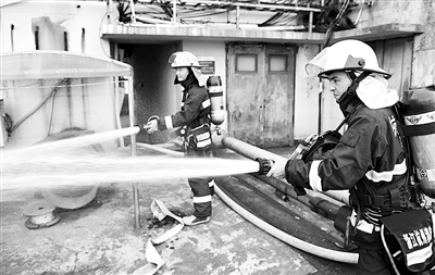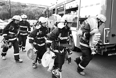 | 演练中的消防员必须全副武装 |