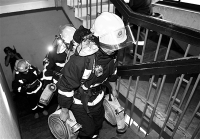 铺设水带看似简单,其实非常辛苦。要知道,40米水带的重量足有40斤重,而战士自身的战斗服和装备,也有40多斤,不要说在这样的酷暑天了,就是大冬天,跑上一趟,也足以让人汗流浃背,气喘吁吁。记者穿着战斗服跟着战士们爬了两层楼,就已经上气不接下气,再也跟不上他们的脚步了。