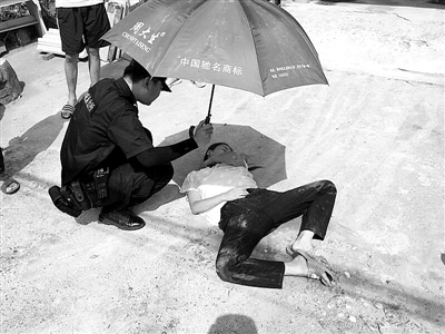 洪哲凯迅速拨打120急救电话,而后蹲下身子,查看女子情况。眼前的女子满头大汗,双眼紧闭,不时抽搐,意识不清,话都说不出来。此时,气温已达36℃,洪哲凯用手一摸地面,热得烫手,而从女子的症状来看,他们也不敢随意挪动她的身体。“可别再给晒伤了。”这样想着,洪哲凯迅速跑到旁边的商店借来一把雨伞,遮住女子的上半身,自己则蹲在女子身边,不时观察情况。
