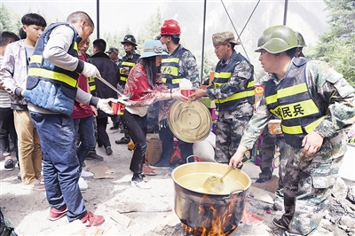 | 在四川省九寨沟县九寨天堂洲际大饭店停车场,救援人员为滞留游客提供食品 新华社 范培珅 摄 |
