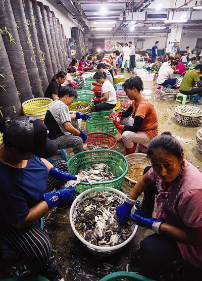 此时正是凌晨时分,水产城人头攒动,一派繁忙,不少渔货经销商正在抢货源。在活鲜交易区,150多个经营户门前,有人挑蟹,有人打包,许多小三轮车在码头和门店间来回穿梭,装车卸货。