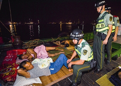 | 卸货后,疲惫不堪的渔船民就地打盹,巡逻民警不忘安全提醒 |